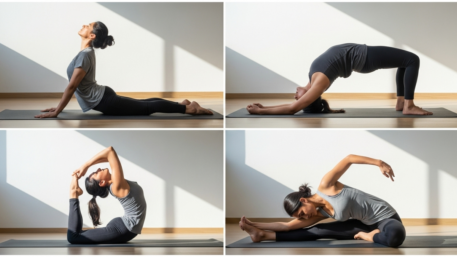 * Lie on stomach, bend knees, hold ankles, and lift chest + thighs upward. Benefits: Stimulates pancreas, balances cholesterol, improves metabolism.
